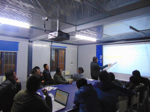 课上,孙经理采用漫画的形式简单明了的展示了格宾石笼的施工顺序和注意事项,介绍了格宾的结构型式、设计要求和质量要求;提醒质量检查部和物资机械部负责人要在原材料采购阶段多了解市场行情,注意细节和产品标准,要依据标准规范严把质量关。孙经理和大家共同结合工程实际展开了广泛的讨论,确定了符合工程实际情况的绞边处理方法。为达到既满足设计要求、又节省格宾材料合理降低成本的目的,孙经理请工程技术人员详细计算、对比了不同尺寸规格格宾的多种组合和布置形式的使用量,选出最经济可行的布置方案并形成施工布置图以指导现场施工。最后,孙经理重点讲解了格宾石笼的施工过程质量检查方法、石材选用标准和格宾石笼的验收标准,并再次强调要保质保量完成合同内的每一项施工项目。