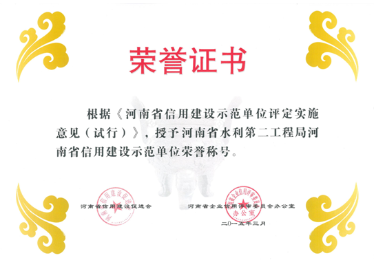“河南省信用建设示范单位”是根据《河南省人民政府关于加快推进全省社会信用体系建设的通知》和《河南省信用建设示范单位评定实施意见(试行)》的规定,由企业自主申报,经省工商局、国税局、地税局、质监局、住房城乡建设厅、人力资源社会保障厅、环保厅等部门审核,省企业信用评审委员会评审会议评审通过,并在国内外主要媒体公示后颁发的荣誉奖项。
