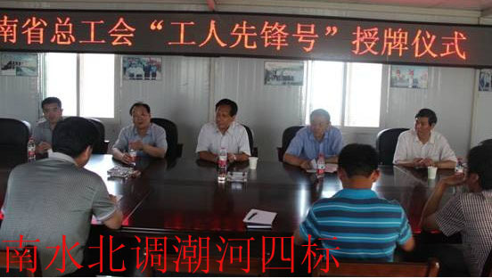 2013年5月24日下午,在工程局党委书记齐文钦和工程局工会主席陈松亭的陪同下,水利厅工会主任马朝运、副主任范少松一行三人来到潮河四标项目部举行“工人先锋号”授牌仪式。