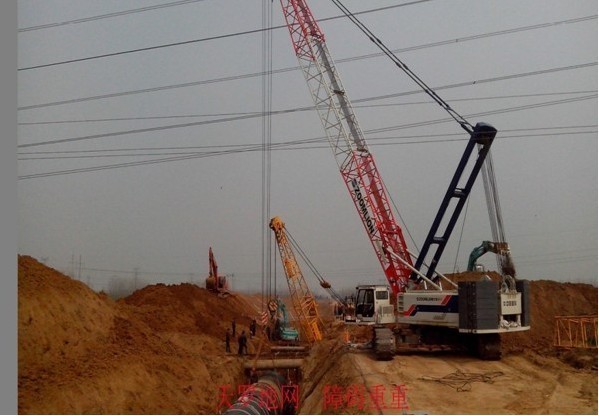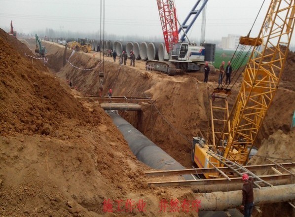 漯河2标经过观摩会之后4天大会战,项目部群策群力,积极与地方沟通协调,与作业队一起共同努力,克难攻坚,成功穿越了排在大家面前的“天罗地网”——近150米管线的距离有:7道输卤管、3条高压线和1条国防光缆,地下地上共11条管线与PCCP管道相互交叉。七道输卤管皆为PVC塑料管,其内输0.8~1.2MPa 60℃的高浓度工业盐水(此压力相当于100m水头压力),安装后上下层新旧管线相距仅30cm;三条高压线分别为1万伏、22万伏和10千伏,净空高度从7.5m到15m不等(而履带吊高在25m左右)。项目部进场勘察好后提前谋划,多次书面向业主反映该输卤管及高压线与管线交叉之事,严重影响管道安装等主体施工,但业主迟迟不能解决。在此情况下,项目部果断决定不再等靠,积极努力,自己解决。
