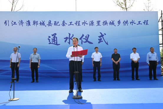 2024年6月30日上午,郸城县配套工程水源置换城乡供水工程通水运行仪式在引江济淮工程调蓄水库举行,郸城县县长董鸿,中州水务控股有限公司党委副书记、总经理申晨亮,公司党委书记、董事长、总经理甘继胜等领导出席仪式,县委副书记宋一兵主持仪式。郸城县水利局主要负责同志、各参建单位主要负责人等参加通水仪式。